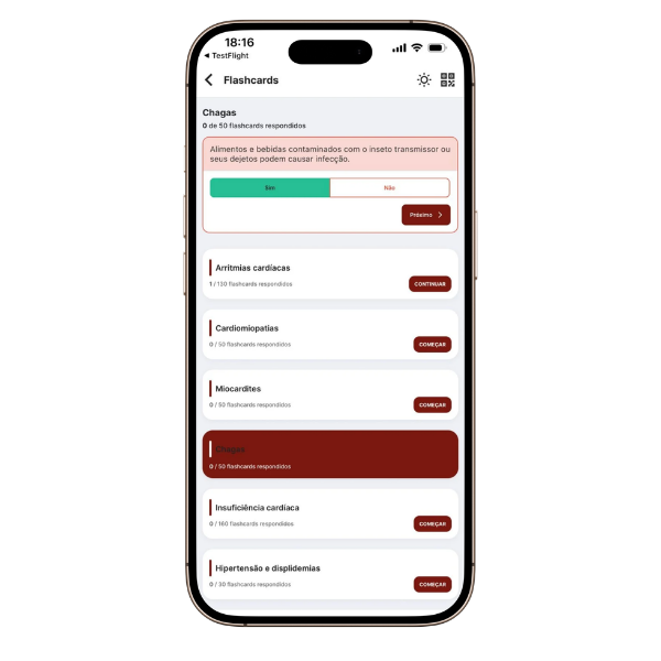 Os flashcards são uma forma rápida e eficaz de revisar conteúdos de cardiologia. Eles ajudam a testar seus conhecimentos de forma objetiva, fortalecendo a memorização ativa e permitindo uma revisão eficiente dos temas.