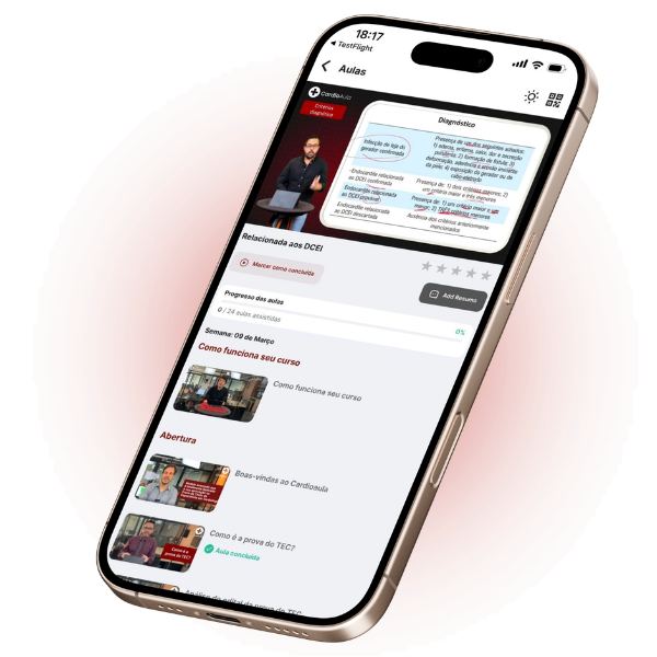 As videoaulas do CardioAula são a combinação perfeita de teoria e prática, fundamentais para a sua atualização em Cardiologia. Cada aula é projetada com questões práticas para reforçar a teoria e proporcionar uma compreensão completa dos temas.